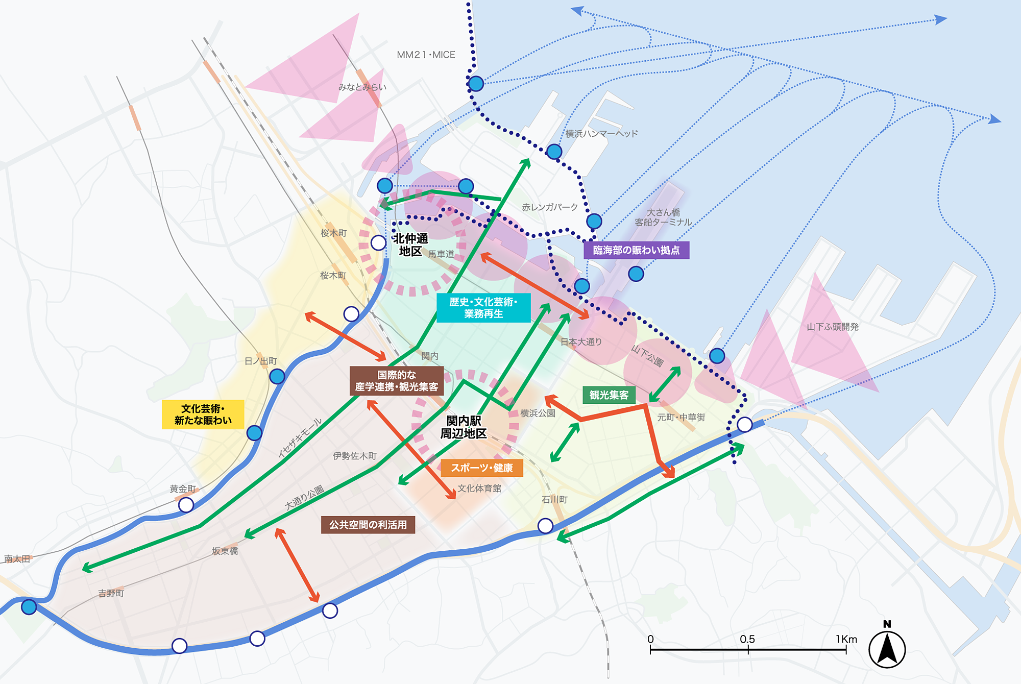 現市庁舎街区を中⼼とする「関内駅周辺地区」と新市庁舎整備が進められている「北仲通地区」という⼆つの結節点における拠点づくりをはじめ、関内・関外地区が有する資源を⽣かし、⼈々を惹きつける賑わいと活⼒につながる新たな魅⼒創出に地区⼀丸となり取り組みます。