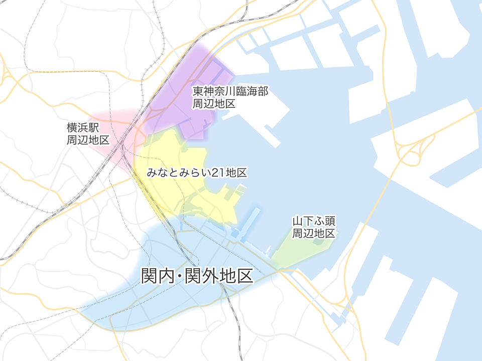 関内・関外地区は「開港の地」です。現在でも数多くの観光客や市⺠が訪れ、港町横浜を象徴すると共に、横浜経済の中⼼を担うエリアであり、市全体の発展を牽引する役割も担っています。